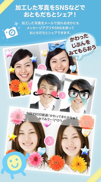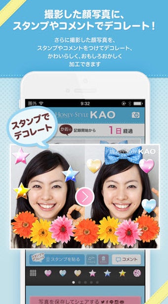 撮影した顔写真にスタンプやコメントなどのデコレーションをして、LINE、Facebook、Twitterなどに共有できます。